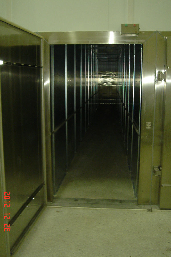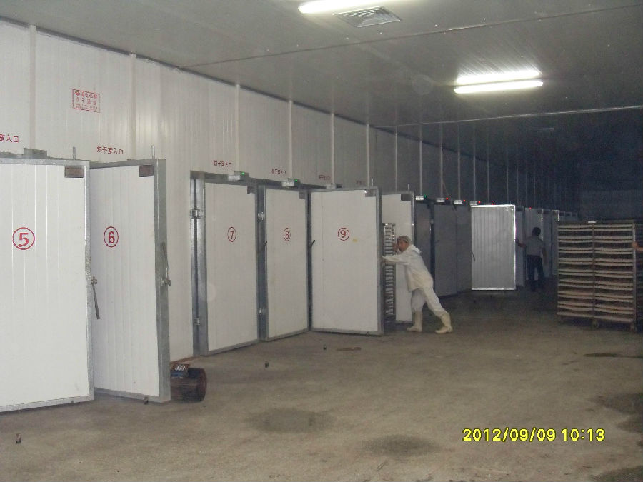 第二種:有兩排車和三排車烘干通道,根據(jù)國外烘干設(shè)備模仿改進而成。熱循環(huán)風(fēng)從兩側(cè)定時反換吹風(fēng),自動調(diào)節(jié)溫度,循環(huán)風(fēng)好,烘干出來的產(chǎn)品均勻,烘干通道內(nèi)溫度能達到85℃以上,烘干過程中不用倒車,一次性烘干,能達到肉制產(chǎn)品蛋白變性。烘干通道兩頭門可以安裝互鎖裝置(用戶也可以安裝溫度自動記錄系統(tǒng))。